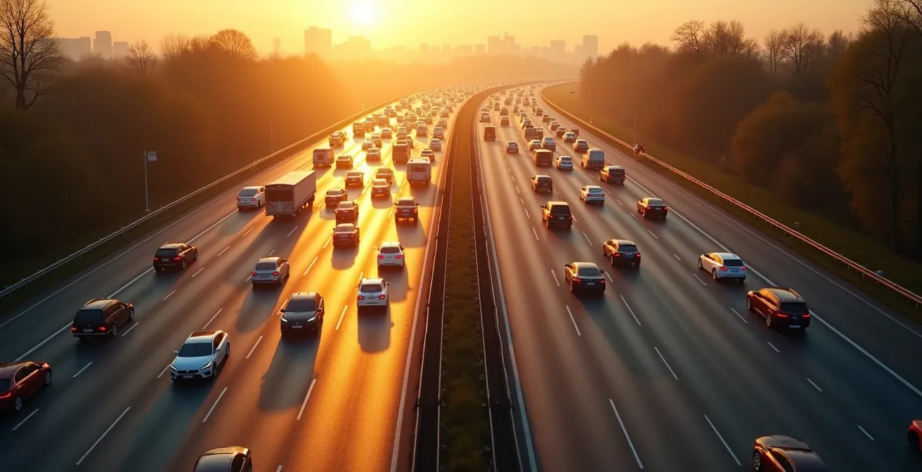 Während die Vermeidung der gesamten Rush-Hour oft eine große Umstellung des Tagesablaufs erfordert, liegt der größte Hebel für die meisten Pendler in einer viel kleineren, aber psychologisch entscheidenden Anpassung. Verkehrsexperten sprechen von der 15-Minuten-Hebelwirkung. Das Prinzip ist einfach, aber verblüffend wirksam: Eine um nur 15 Minuten frühere Abfahrt am Morgen kann die gesamte Fahrzeit oft um 25 bis 30 Minuten verkürzen. Dieser überproportionale Gewinn entsteht, weil Sie damit die kritische Masse an Fahrzeugen unterbieten, die das Verkehrssystem an den Rand des Kollapses bringt.