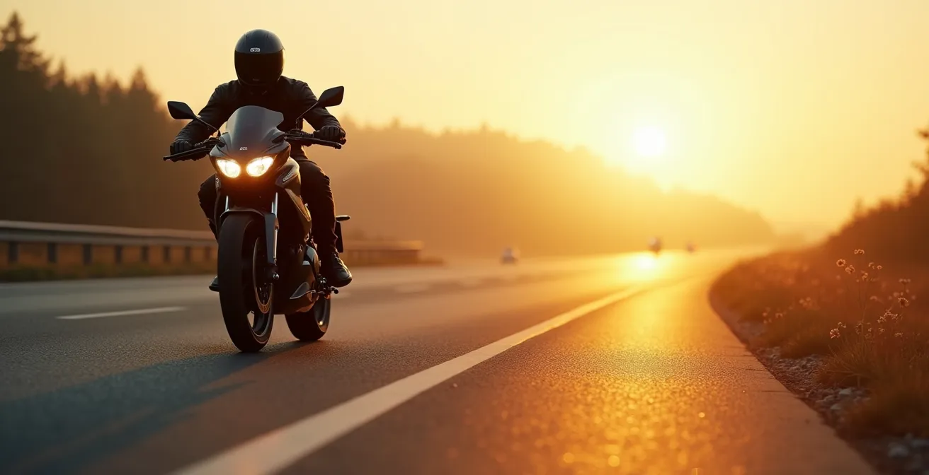 Der erste Schritt ist das Zwiebelprinzip: Tragen Sie mehrere dünne Schichten Funktionsunterwäsche statt eines dicken Pullovers. Dies isoliert besser und leitet Feuchtigkeit vom Körper weg. Der zweite, oft unterschätzte Faktor ist die passive Sicherheit durch Sichtbarkeit. Bei grauem Wetter und Nieselregen verschwimmt ein dunkel gekleideter Motorradfahrer mit dem Hintergrund. Helle Farben und retroreflektierende Einsätze sind hier keine modische Spielerei, sondern ein überlebenswichtiges Feature. Die Empfehlung des Deutschen Verkehrssicherheitsrats für Herbstfahrten ist eindeutig: Kleidung nach Norm EN 20471, die die Sichtbarkeit um bis zu 300% erhöht, kann Unfälle verhindern.